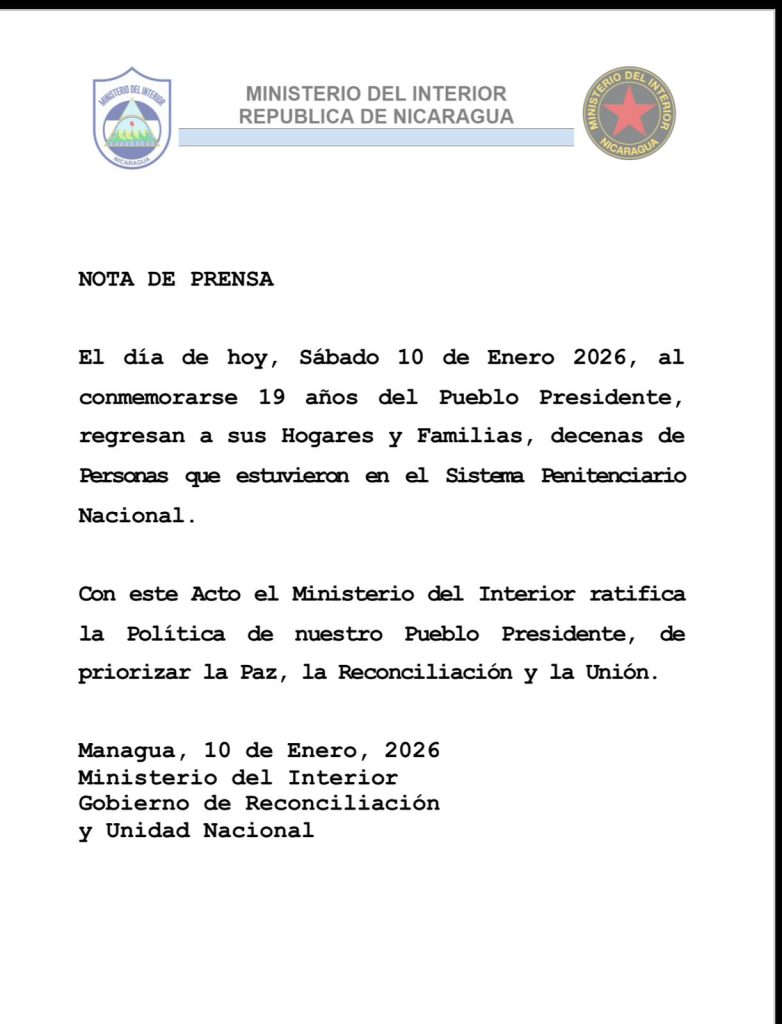 La nota oficial emitida en horas del mediodía del 10 de enero, destaca que esta acción reafirma la política del Gobierno de Reconciliación y Unidad Nacional de priorizar la paz, la reconciliación y la unión entre los nicaragüenses.